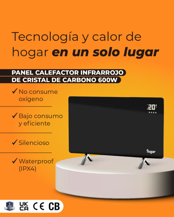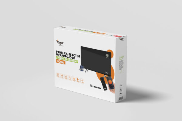 El Panel Calefactor Infrarrojo de Cristal de Carbono 600W Yogar® combina diseño sofisticado y tecnología alemana. Su acabado en espejo negro embellece cualquier espacio. Proporciona una calidez rápida y uniforme. Ofrece confort eficiente y sostenible. Optimiza el consumo energético gracias a su rendimiento de 600W.